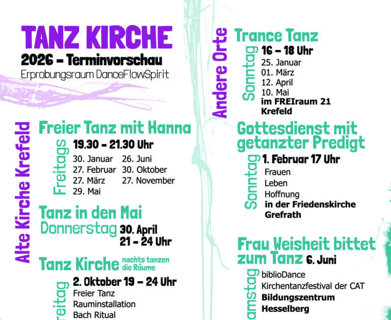 Am 30. Januar 2026 laden wir wieder ein zum Freien Tanz mit Hanna Agurski, zur Tanzkirche am Freitag, 19.30 - 21.30 Uhr in der Alten Kirche Krefeld.
